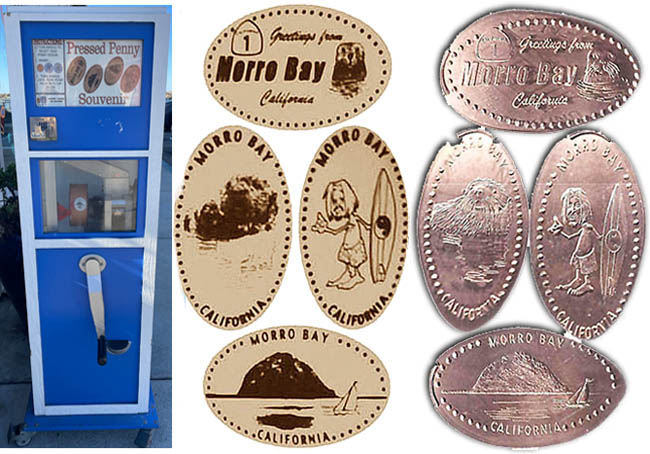 Machine 1 is outside by the north corner of the building, Cost to press: 51¢ for each design. Designs all have a beaded border with 'Morro Bay California':