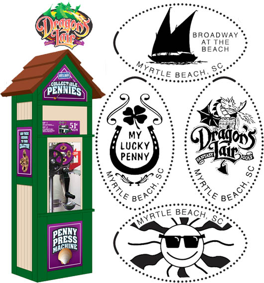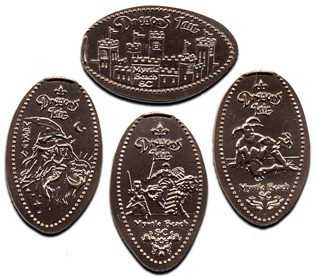 Retired 2: All have 'Dragon's Lair, Myrtle Beach, SC' on them: 1) Castle, 2) "Merlin" next to a wizard, 3) A jester, 4) Two knights battling, where one is on horseback