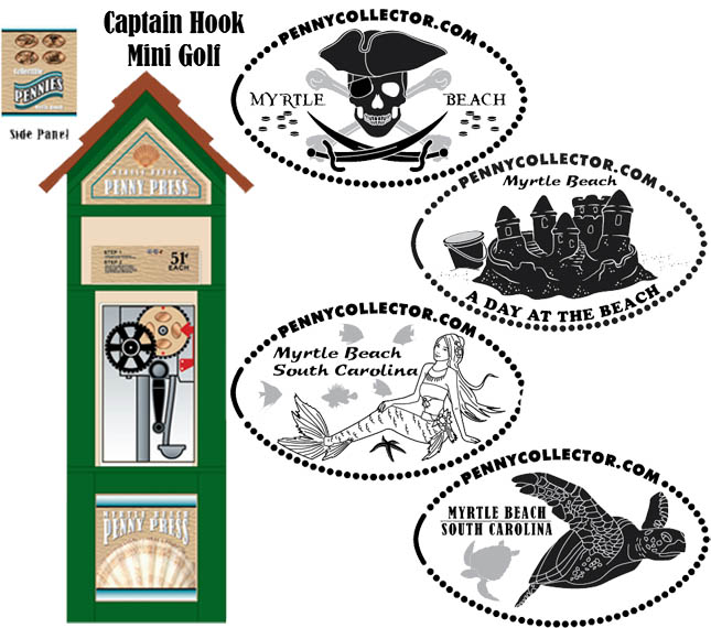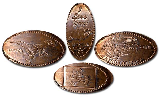 Retired 1 designs: 1) "Raptor" by a velociraptor, 2) "I Love You Myrtle Beach SC" with an arrow piercing two hearts, 3) "T-Rex Myrtle Beach SC" by a tyrannosaurus rex head, 4) the Jolly Roger skull and crossbones flag