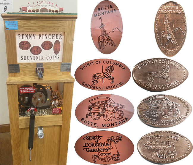 Machine 1 is inside the entrance to the carousel. Cost to press: 51¢ each design. Designs all have a beaded border: