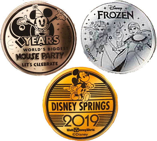 Retired from Token Machine 1: 1) 'Disney Frozen', Anna, Elsa, Olaf, 2) '90 Years, World's Biggest Mouse Party, 3) 'Disney Springs 2019', Mickey.