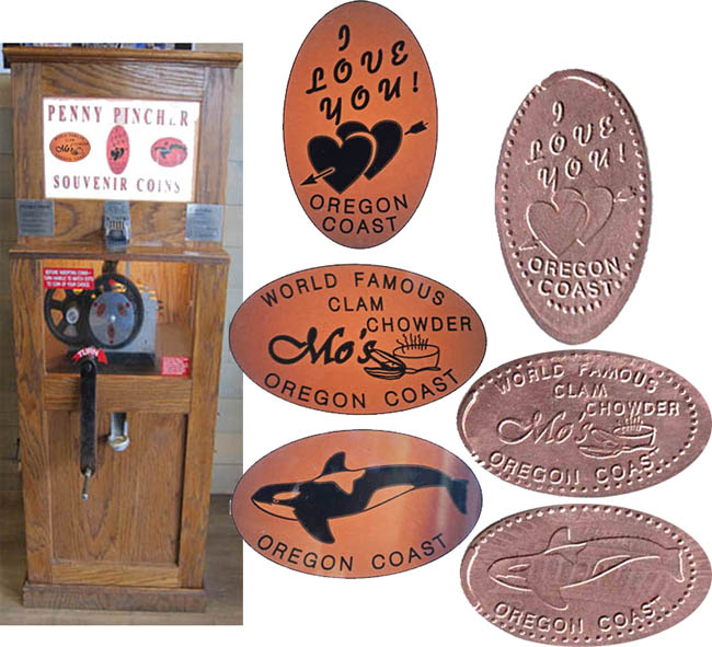 Machine 1 is inside the main entrance to the right. Cost to press: 51¢ each design. Designs all have a beaded border with 'Oregon Coast':