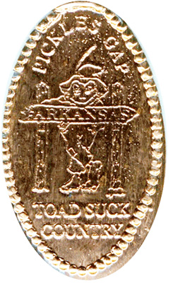The coin is very unique in that it says, "Toad Suck Country," as well as "Pickles Gap," and "Arkansas," and features a humorous toad-like creature in patched pants leaning on a fence post - a reference to the editorial cartoon series, by the same name, drawn by award-winning cartoonist, MiltonDavis of Conway, AR