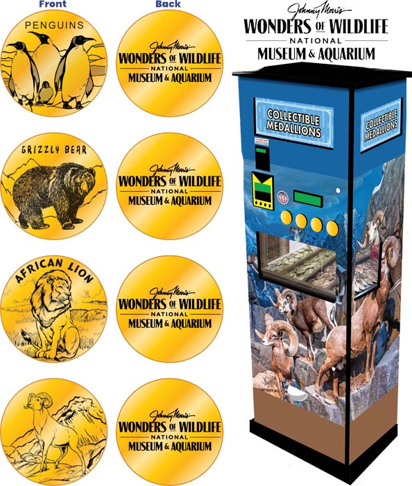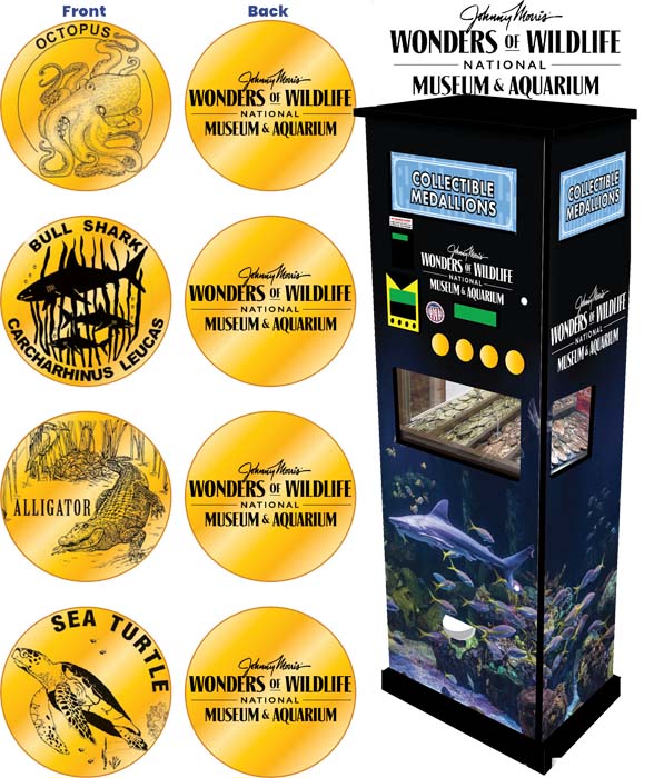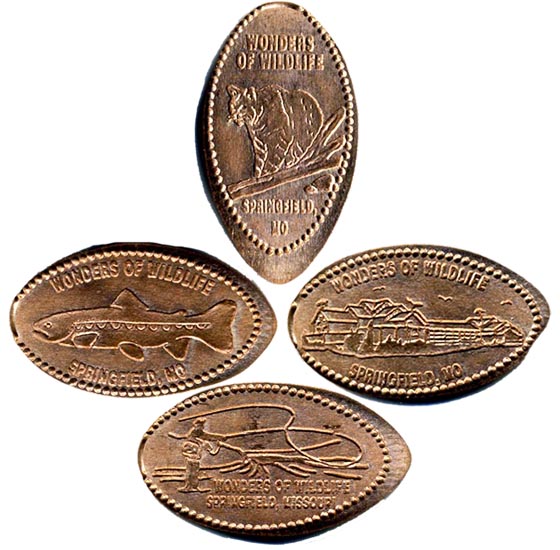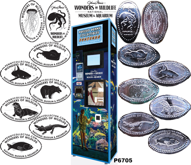 Machine #4 has been moved to the gift shop which you can access without entering the aquarium. The machine is preloaded with new zinc pennies and the cost is $1 each or all 8 pennies for $5. It takes cash or credit cards. The machine is near the end of the aquarium right before you get to the shark and stingray touch area. All have 'Wonders of Wildlife National Museum and Aquarium' on them except Octopus which has 'Wonder's of Wildlife Johnny Morris' on it