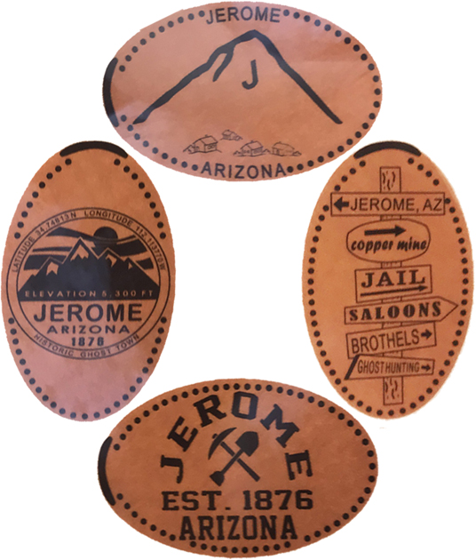 3) 'Jerome Arizona 1876, Historic Ghost Town, Elevation 5,300 ft Latitude 34,74813 N, Longitude 112,113370 W', Round logo,