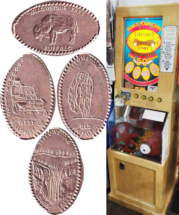 Machine 1: is inside of gift shop. Cost to press: 51¢ each design. Designs all have a beaded border with 'Yellowstone':