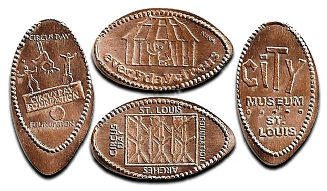 Retired 1: 1) 'Circus Day foundation', Logo, circus acts , 2) 'Circus Day foundation St Louis Arches', Box logo with acrobat group, 3) 'everydaycircus', Circus tent with Elephant peering out, 4) 'City Museum St Louis'.