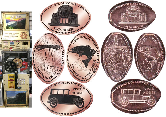 Machine 1 is downstairs in the gift shop right by the entrance to it. Cost to press: pre-loaded with Zinc pennies for $1 each design ($1.00 dollar bill only; no quarters accepted). Designs all have a pennycollector.com beaded border: