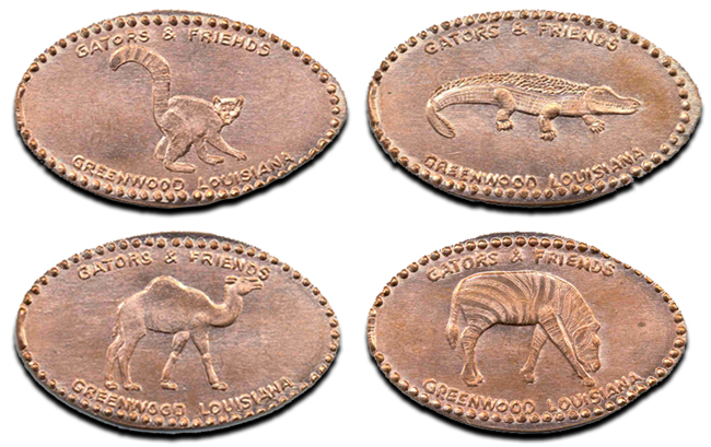 Machine 1: Pennies. All have 'Gators & Friends Greenwood Louisiana' on them. Designs are: