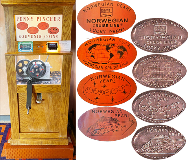 Machine 1 is on Deck 7 in the hall on the starboard side about mid-ship as you walk under the signage for the Lotus Garden restaurant. Cost to press: $1.99 each design that is pre-loaded with Zinc American pennies. You need to swipe your cabin keycard to use the machine; no cash is accepted. Designs all have a beaded border with 'Norwegian Pearl':