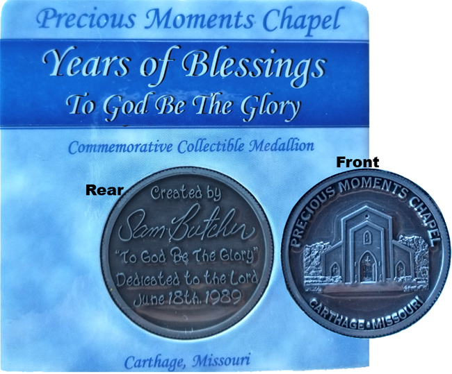 1) 'Precious Moments Chapel Carthage, Missouri', Chapel building/ Rear- 'Created By Sam Butcher' "To God Be the Glory", June 18th 1989'