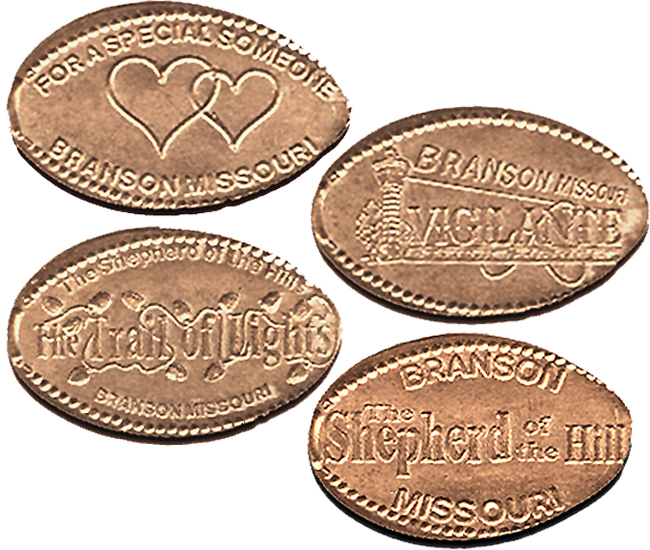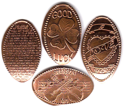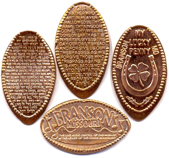 Moved 2 (Moved to Those Were the Days Memory Barn, Near the World's Biggest Toy Museum: 1) (h) Psalms 23, 2) "The Lord's Prayer," All of it! 3) (v) Horseshoe, Four-leaf Clover, "My Lucky Penny," "Branson, MO." 4) (h) Text, "Branson, Missouri," "The Live Music Capital of the World in the Heart of the Ozark, Mountains."