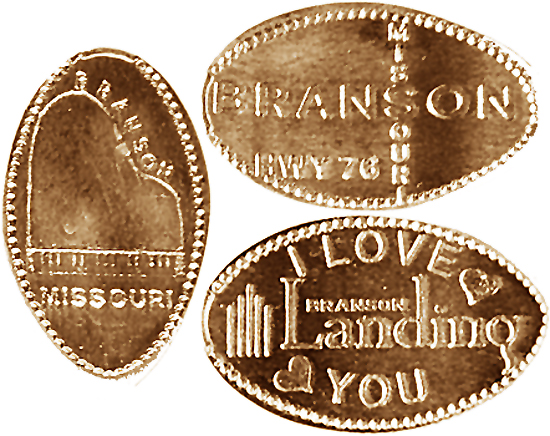 3) I LOVE heart/tiny BRANSON/large Landing/heart YOU. There is also what I think is a logo for the fountain, to the left of "Landing". (H)