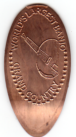 Single die machine with a vertical penny that says WORLDS LARGEST BANJO across the top and GRAND COUNTRY across the bottom. There is a banjo in the middle.