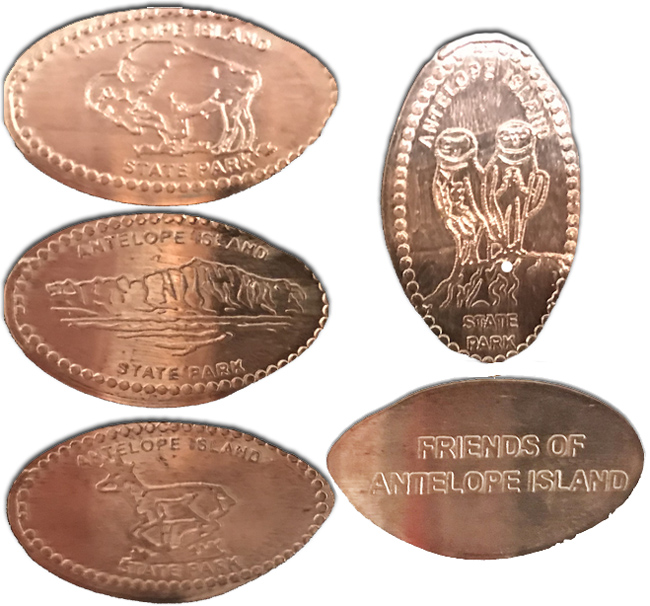 Machine 1: Located just inside the door. All say Antelope Island State Park. The reverse all say Friends of Antelope Island. Designs are: