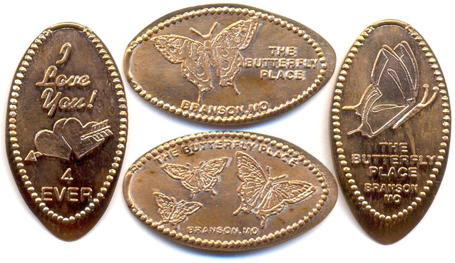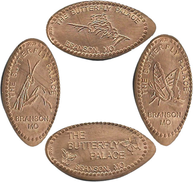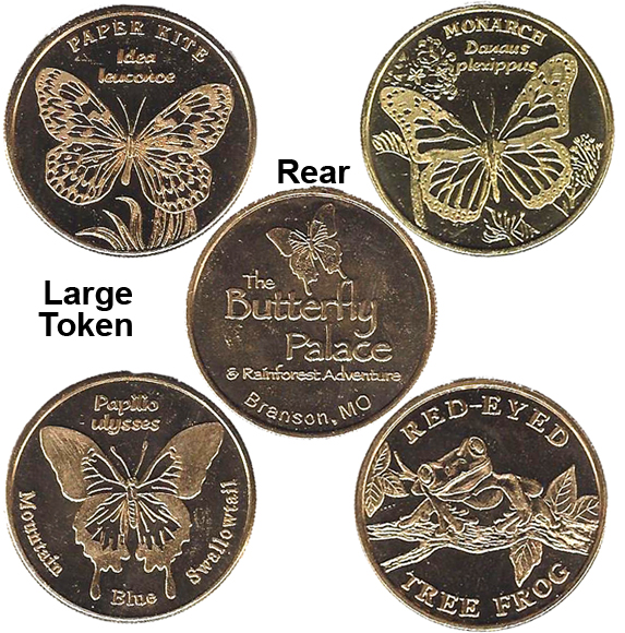 Token machine 1 Rear says 'The Butterfly Palace & Rainforest Adventure Branson, MO'. Designs are: