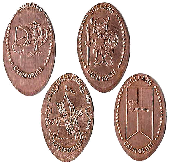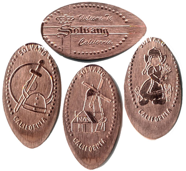 Retired 1: 1) 'Greetings from Solvang California', Windmill and flag. 2) 'I (Heart) Solvang', 3) Bearded Viking head with large beard and in traditional hat, 4) Traditionally dressed Woman in front of windmill.