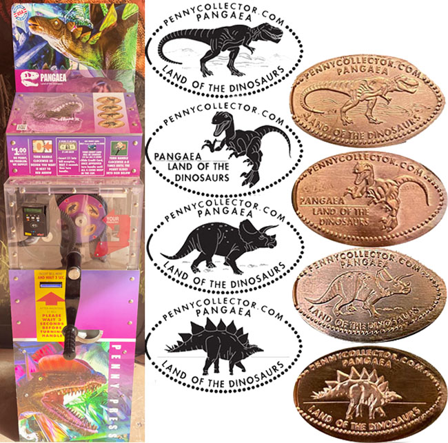 Machine 1 (Placed 9/19) is outside the entrance to the Pangaea Land of the Dinosaurs. Cost to press: $1.00 each design (dollar bills only; no quarters accepted). No pennies required. This is a new type PennyCollector machine that accepts a $1.00 bill for each design, or a credit card for a $4.00 charge for all four designs only and after hand cranking, presses a pre-loaded zinc penny. Designs all have a pennycollector.com beaded border with 'Pangaea Land of the Dinosaurs':