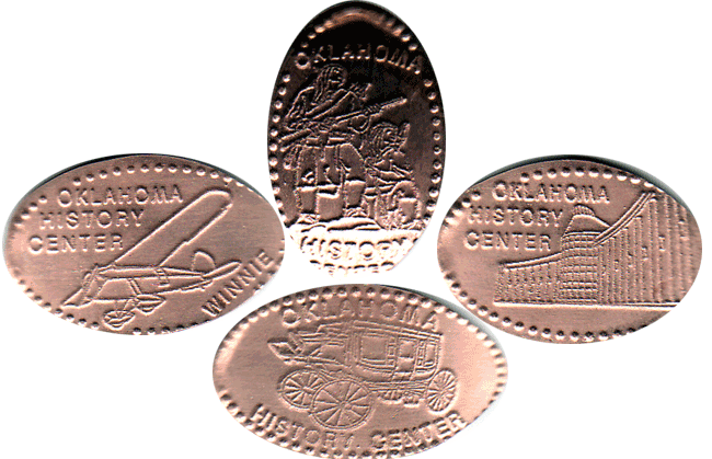 Machine is located inside the front door next to the gift shop. All have 'Oklahoma History Center' on them. Cost is 2 quarters and a penny ($.51). Designs are: