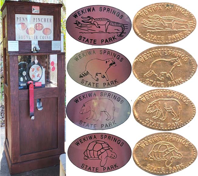 The machine is located under the roof of the nature center, at the top of the hill, overlooking the headland of the spring. All have 'Wekiwa Springs State Park' on them. Designs are: