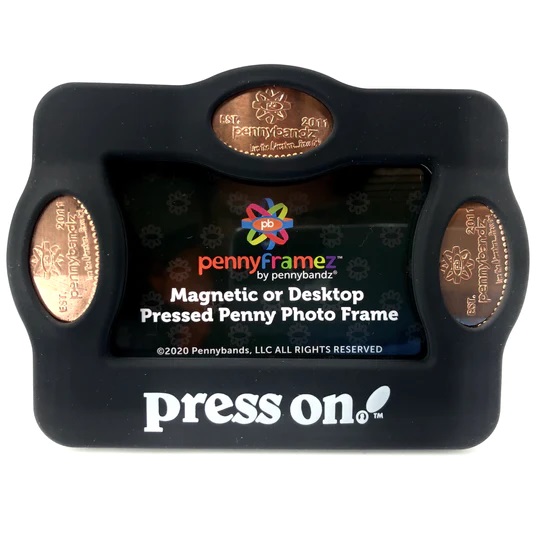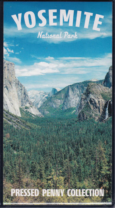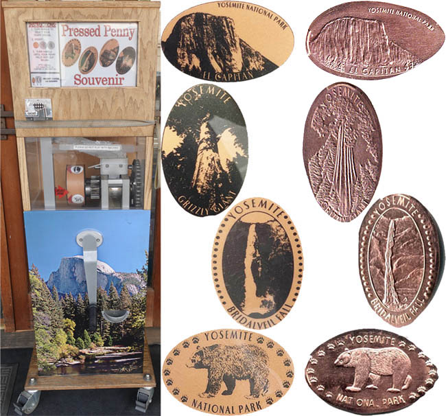 Machine 1 is outside in front of the entrance door. Cost to press: 51¢ each design. Designs all with 'Yosemite':