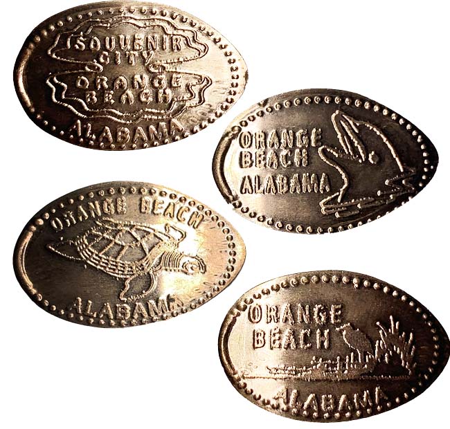 The machine is to the left of the entrance next to a change machine. All designs cost 51 cents to press. All are horizontal and have Orange Beach' on them.