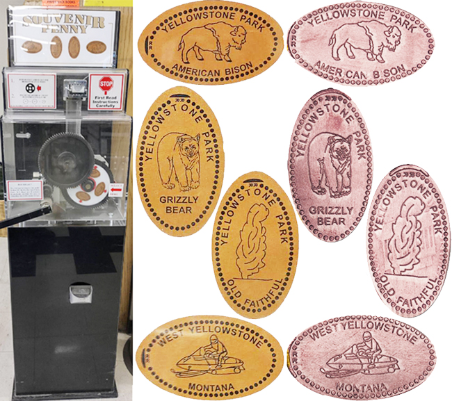 Machine 1 is inside the store about halfway down the right hand wall in front of the checker stands. Cost to press: 51¢ each design. Designs all have a beaded border and 'RR' at the catch notch: