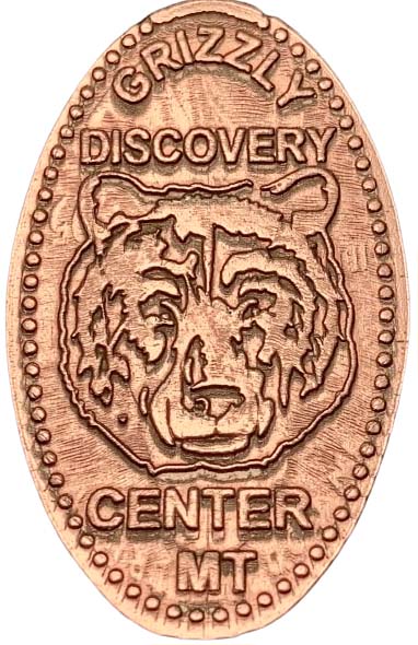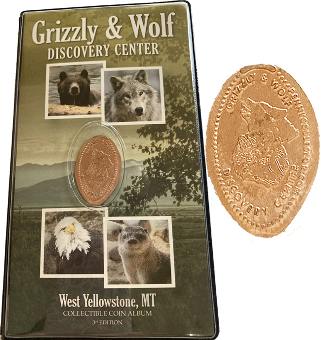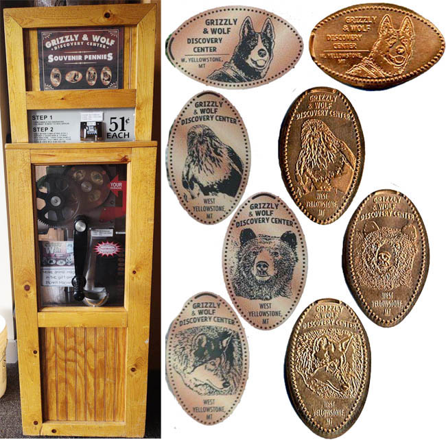 Machine 3: is near the front doors to the gift shop. Cost to press: 51¢ each design. Designs all have a beaded border with 'Grizzly and Wolf Discovery Center West Yellowstone, MT':
