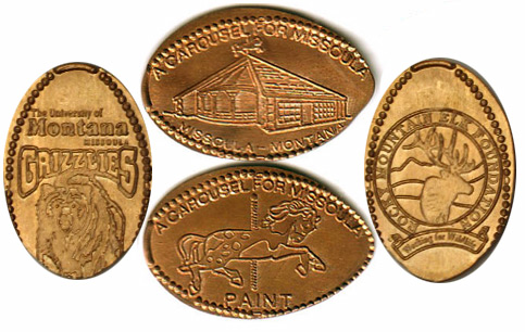 Retired 1: 1) (V) Bear with 'The University of Montana Missoula Grizzlies', 2) (H) Carousel building with 'A Carousel for Missoula Missoula - Montana', 3) (H) Paint the horse with 'A Carousel for Missoula Paint', 4) (V) An Elk in front of mountains surrounding by a circle and a banner with 'Rocky Mountain Elk Foundation Watching For Wildlife'.
