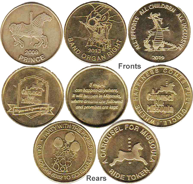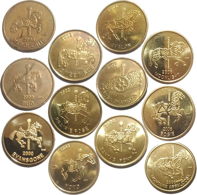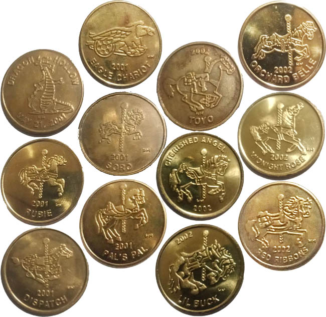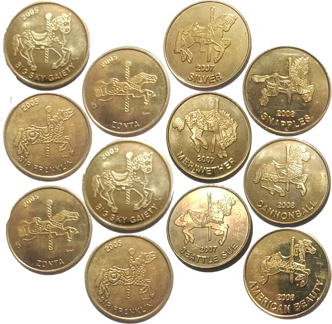 Obverse: 40 designs, mainly the carousel horses. Most have years on them. Some are listed below: