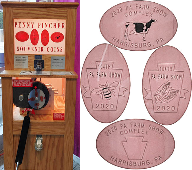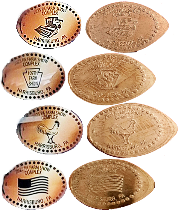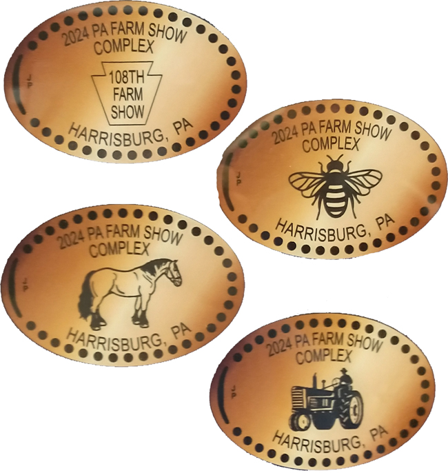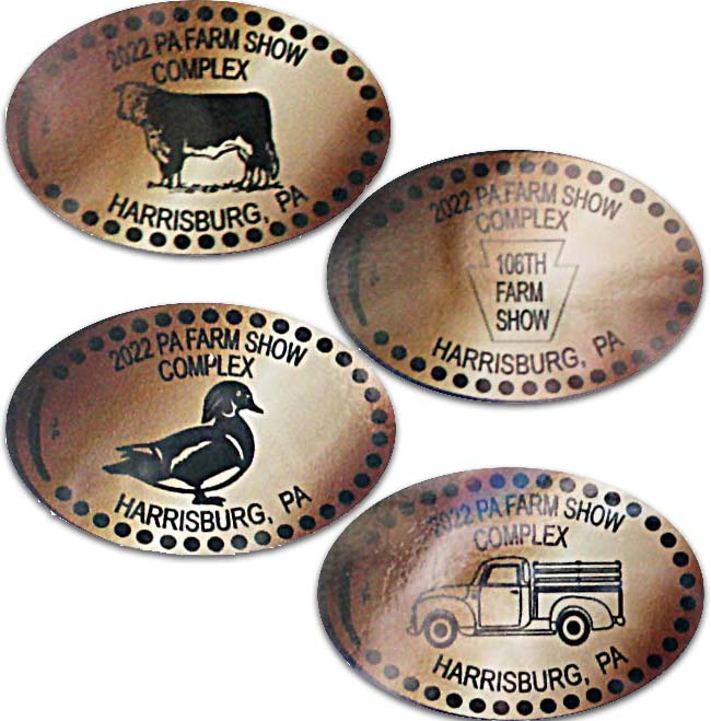 Retired 2: All have '2022 PA Farm Show Complex Harrison, PA' on them: 1) A Duck, 2) A cow, 3) a pickup truck, 4.) '106th Farm Show', the Farm Show Logo