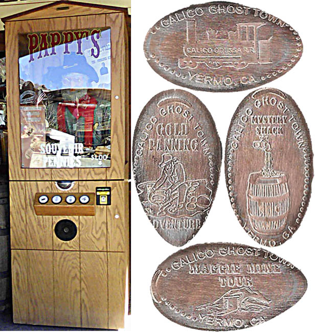 All have 'Calico Ghost Town Yermo, CA' on them. This is a 'Pappy' (dressed as a Gold Miner) machine. cost $1,00 each (Dollar bills only, pre-loaded with Zinc pennies, Electric push button). Designs are: