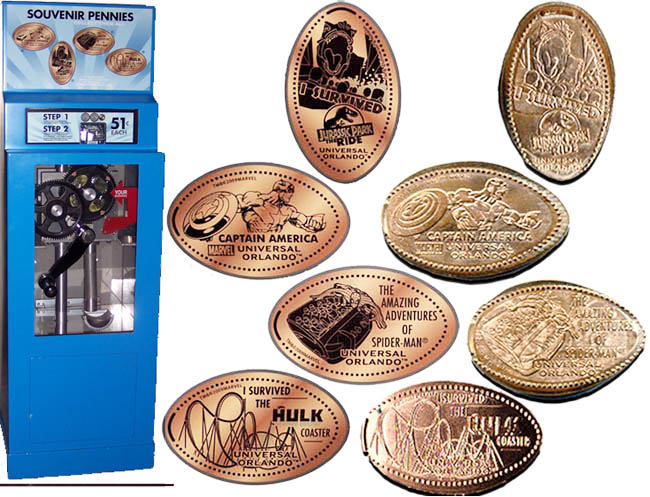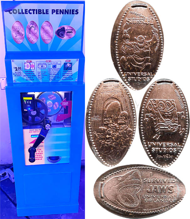 Machine 1: All have Universal Studios' on them. The price is now $1.00 and is pre-loaded with zinc pennies.