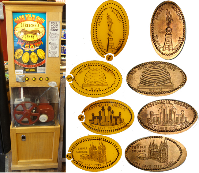 Machine 1 (Moved here 7/2020) is inside to the left of the entrance door. Cost to press: 51¢ each design. Designs all have a beaded border: