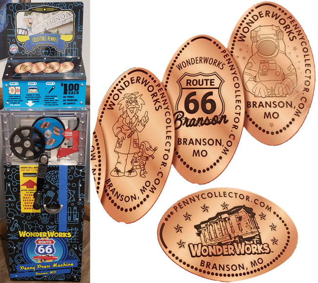 2835 W 76 Country Blvd Branson , MO , 65616 Phone: 417-231-9999 Website The machine is by the entrance. Cost is $1 bill and no penny needed (Pre loaded Zinc Pennies)