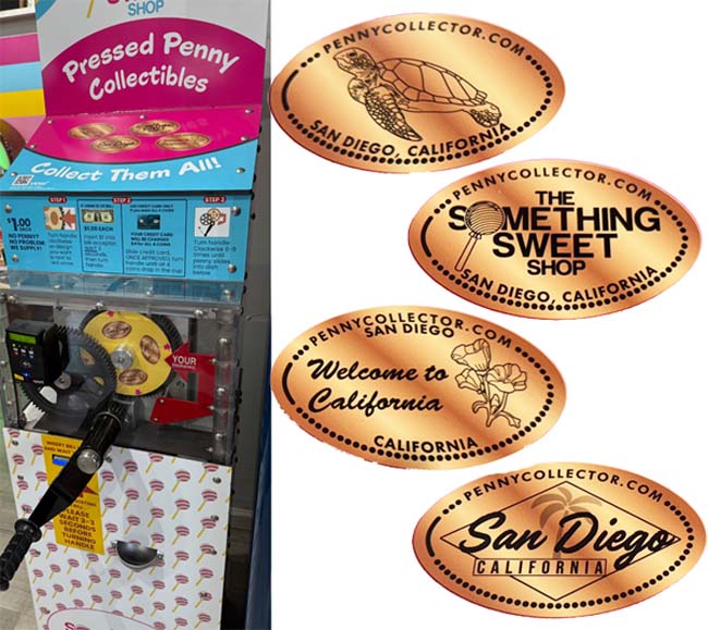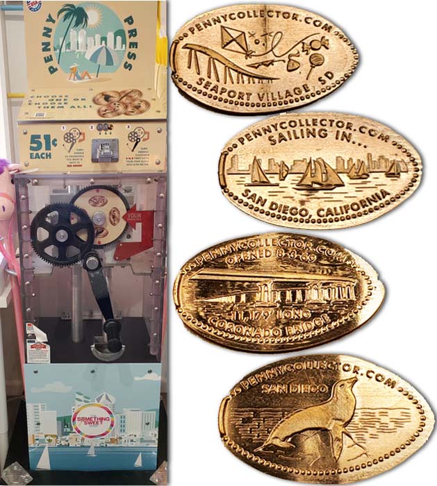 The machine is inside Seaport Village’s only candy shop next to the duck pond! Includes special branded The Something Sweet Shop penny!.