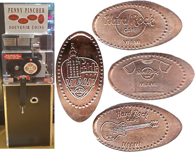 Machine 1 is just inside the Rock Shop, just to the right of the elevator when you walk through the main doors. Cost to press: $1.01 each design. Designs all have a beaded border with 'Hard Rock Cafe Miami':