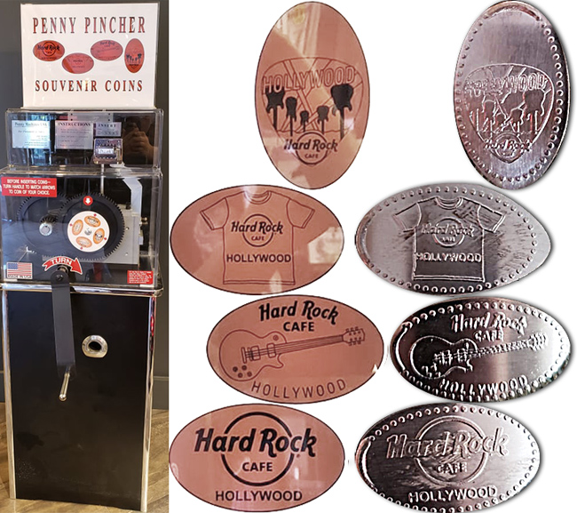 The machine is in the Rock Shop. All have 'Hard Rock Cafe Hollywood' on them. Designs are: