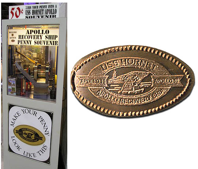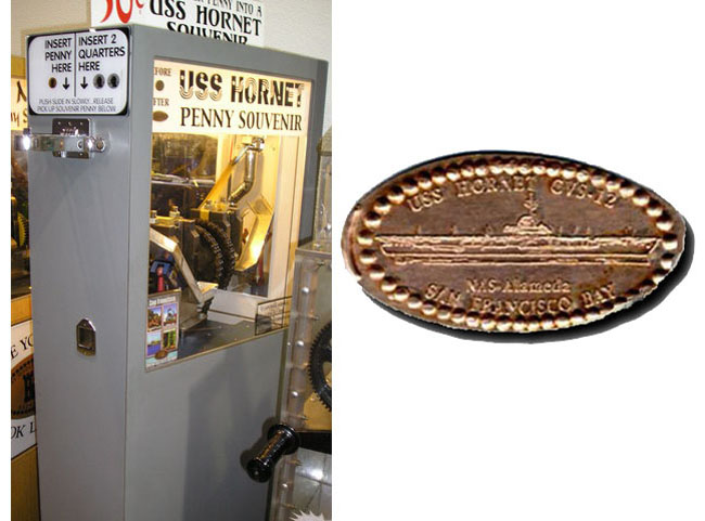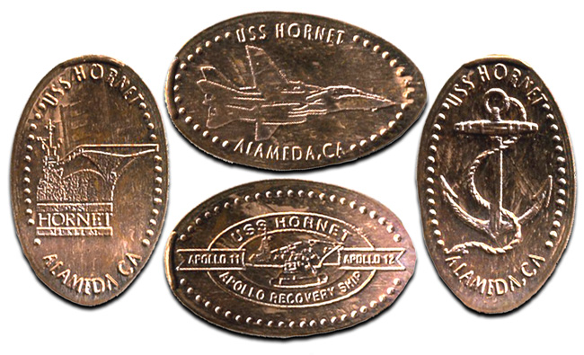 Machine 3: All have 'USS Hornet Alameda, CA' on them. The machine is in the ship store onboard the ship on the Hanger Deck. Designs are: