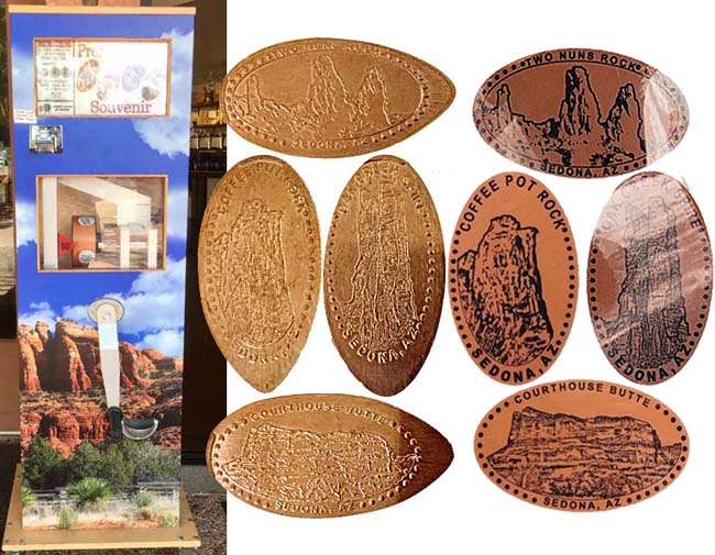 Machine 2 (Moved here from Divine Olive Oils and Vinegars) is outside in front. Cost to press: 51¢ each design. Designs all have a beaded border with 'Sedona, AZ':