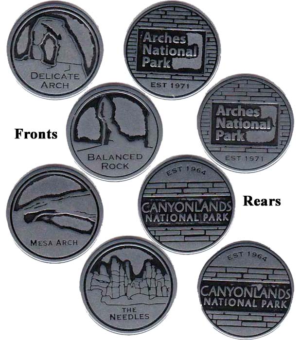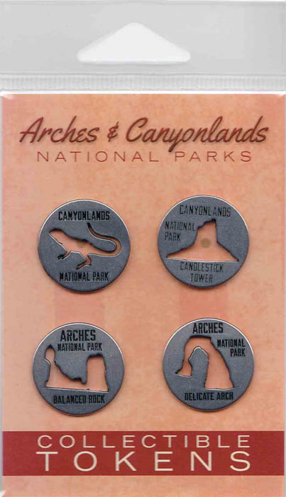 1" mini-tokens ($1.00 each plus tax), four pre-packaged 1" mini-tokens ($3.96 each plus tax), a Delicate Arch token ($6.99 plus tax) and a Peaks, Plateau and Canyons of the Colorado Plateau Collectible mini-token book ($4.99 plus tax) are for sale in the gift shop.