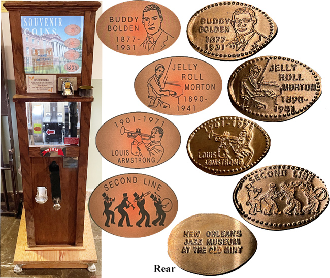 Machine 1 is on the first floor on the other side of the wall behind the ticket counter. Cost to press: 01¢ each design (no quarters needed). Designs all have a beaded border: