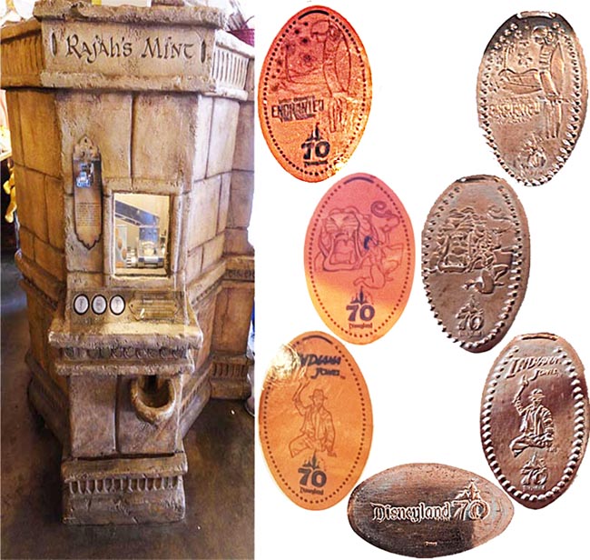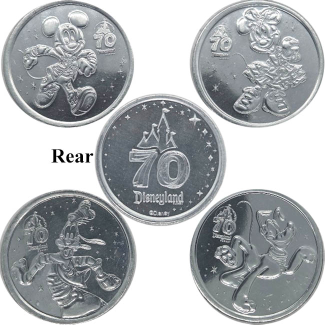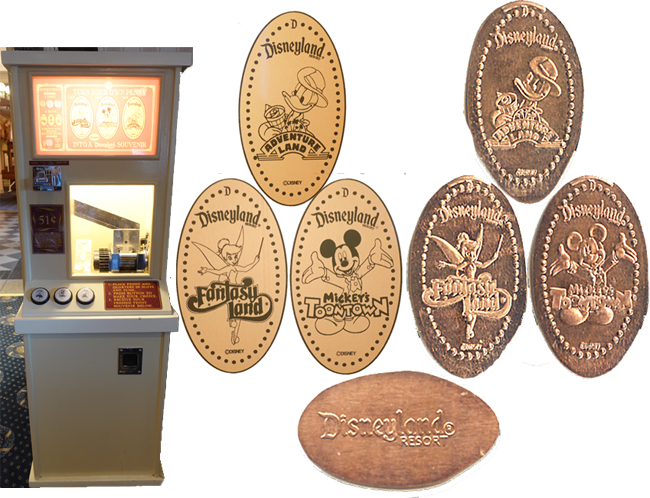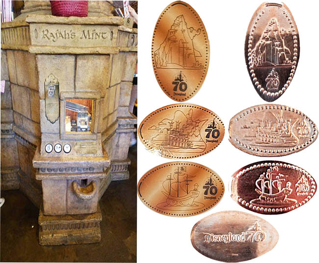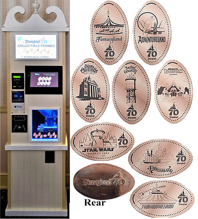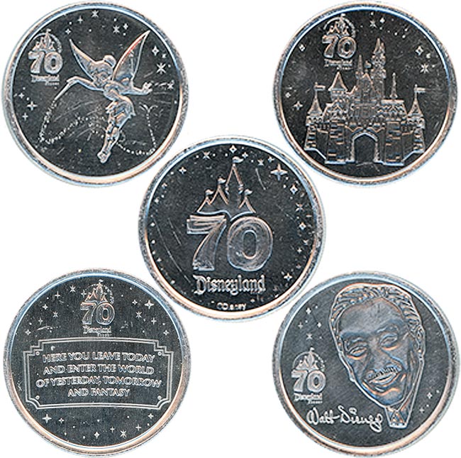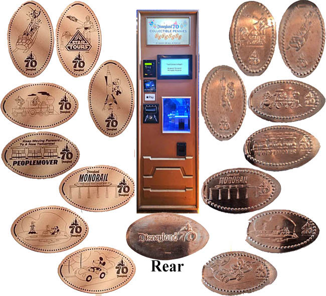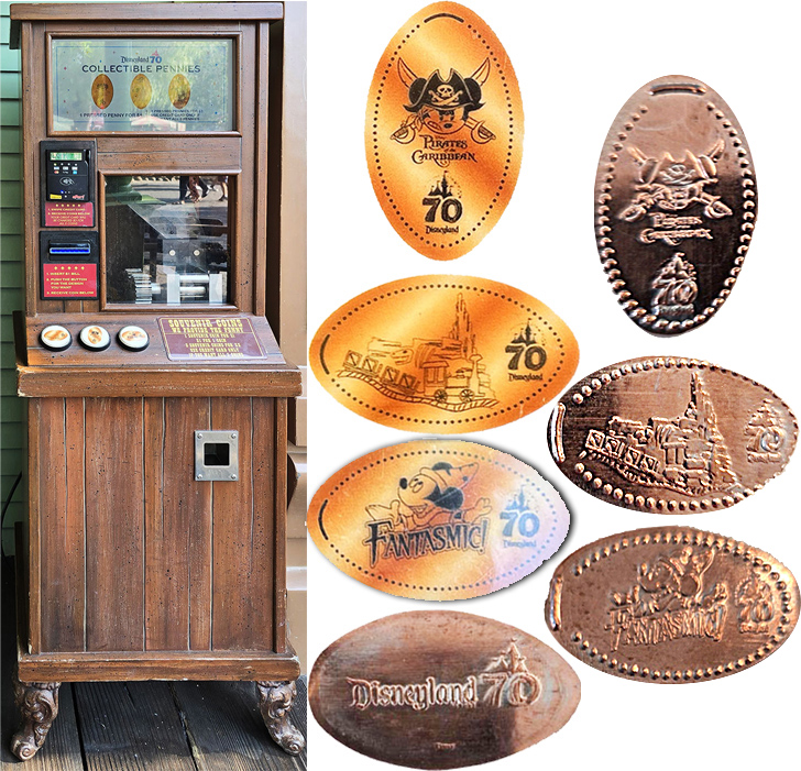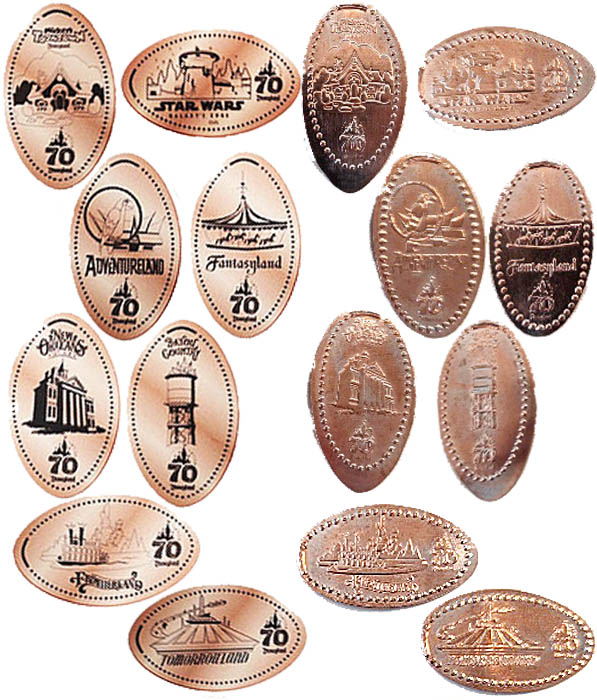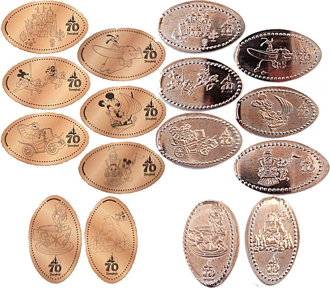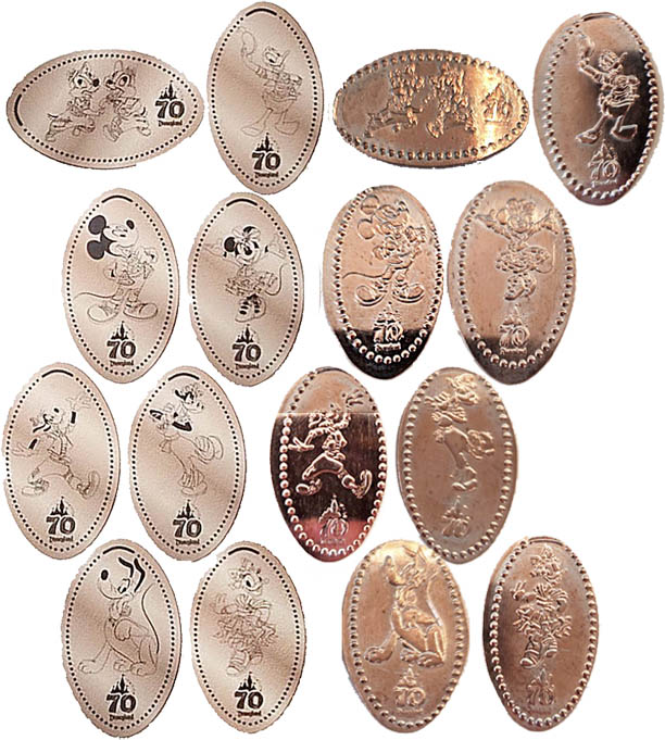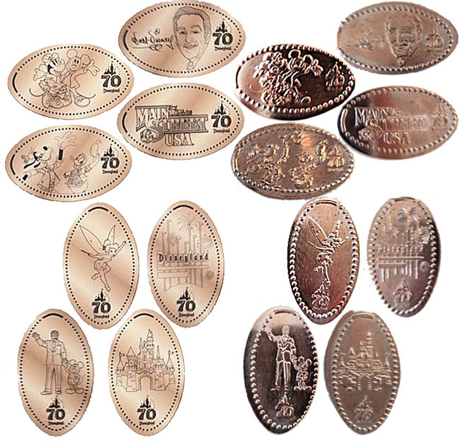 E) Penny Arcade, Candy Palace: 70th Anniversary Designs: 1) 'Walt Disney', (signature) his head, 2) Mickey & Minnie, 3) Walt and Mickey standing holding hands, 4) 'Main Street USA', 5) Donald and Goofy, 6) Cinderella's Castle, 7) Tinkerbell, 8) Disneyland entrance sign.
