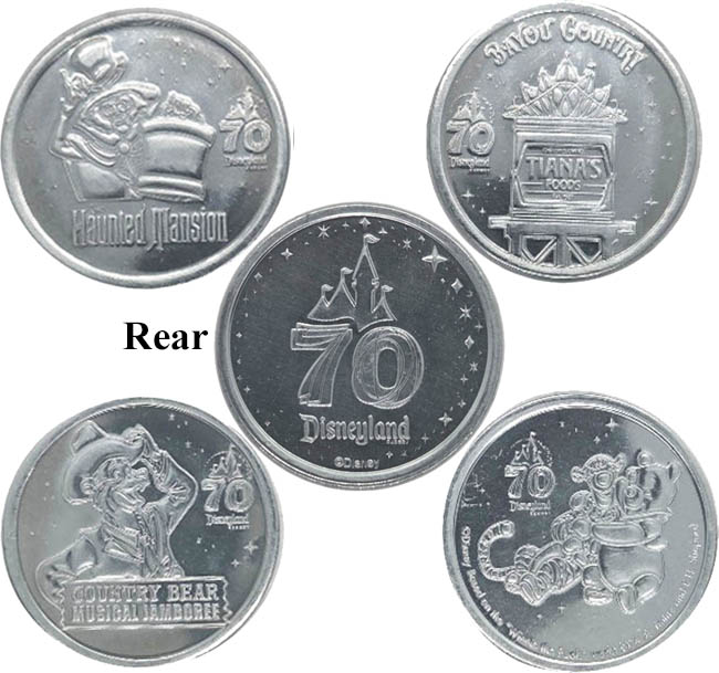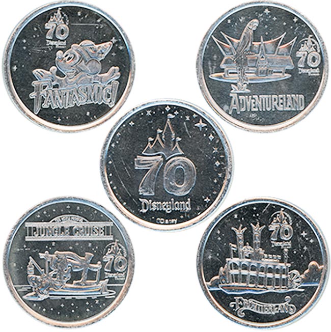 B) Pioneer Mercantile: Tokens (2025/ 70th Anniversary) DM206 to 209 1) Fantasmic, 2) Adventureland, 3) Frontierland, 4) Jungle Cruise/ Rear- 70 Disneyland,