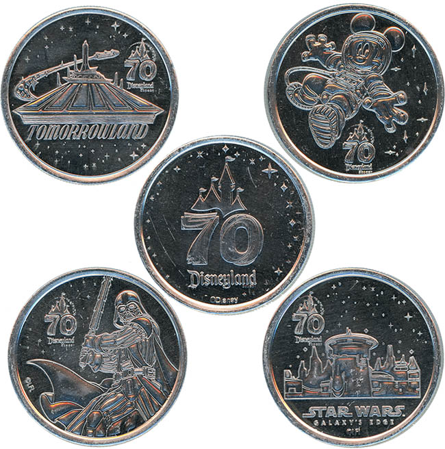 G) 2024 Space.Mountain exit corridor #2, (DRM Medallions 0214 to 0217/ 1) Astronaut Mickey, 2) Space Mountain logo, 3) Darth Vader, 4) Star War's Galaxy 1961/ Rear- 70 Disneyland.