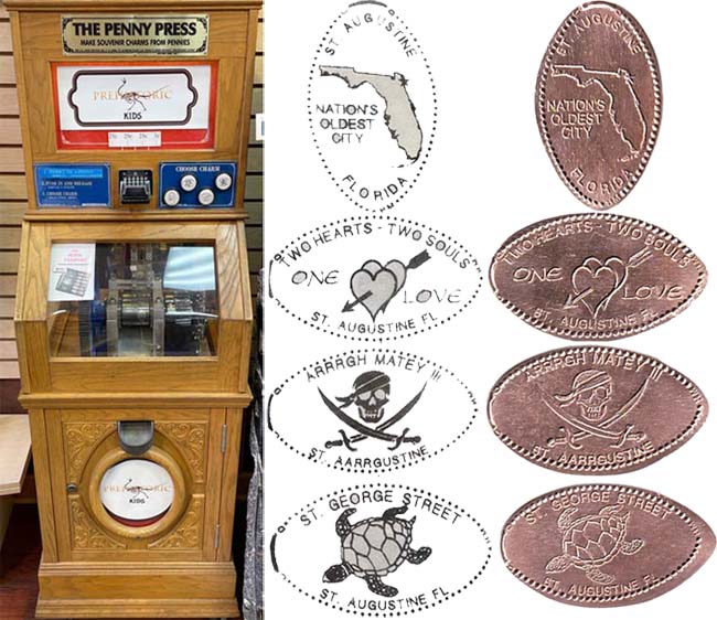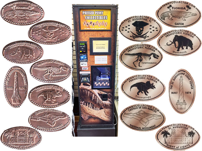 Machine 1 is to the left as you enter the store. Cost to press: pre-loaded with Zinc pennies for $1 for one ($1.00 dollar bill only) $5 for all 8; no change given. Credit card for $5 charge for all 8 designs only. Designs all have a pennycollector.com beaded border except the Lighthouse design which just has a beaded border: