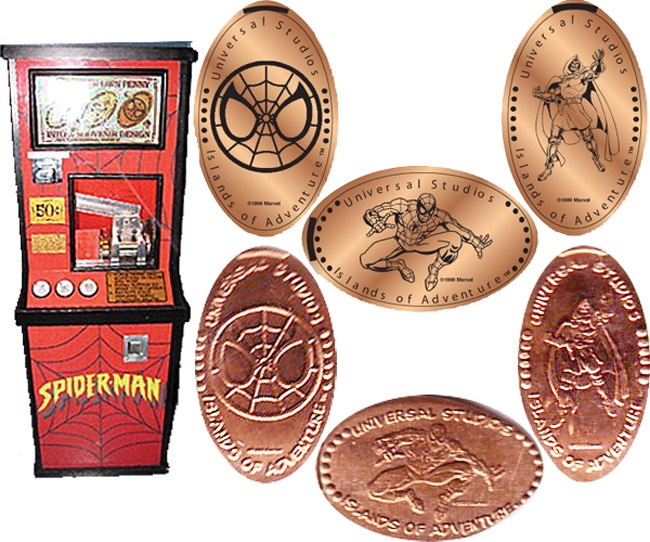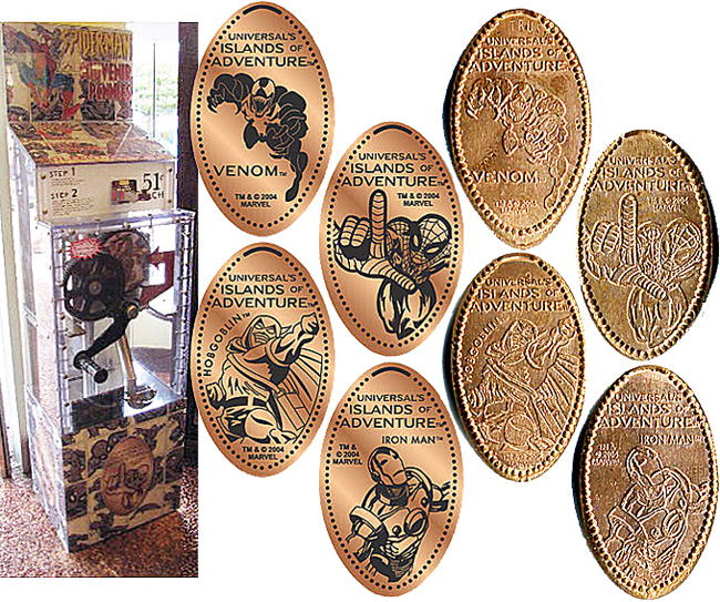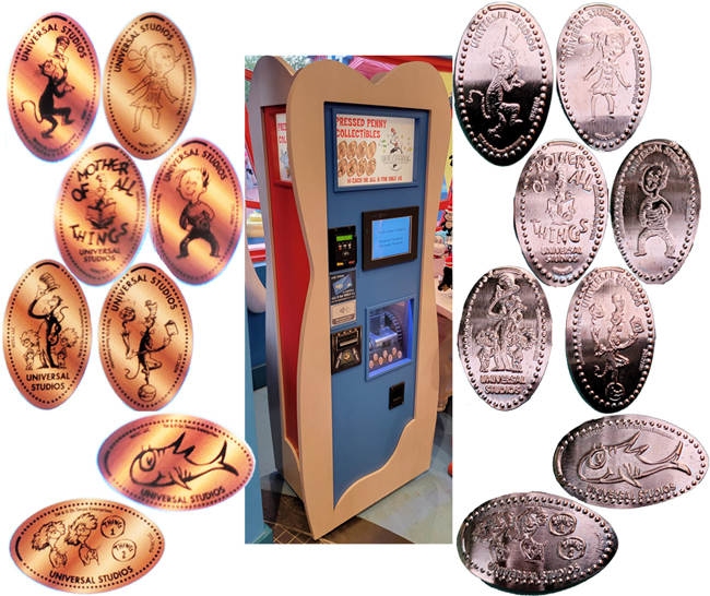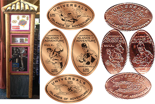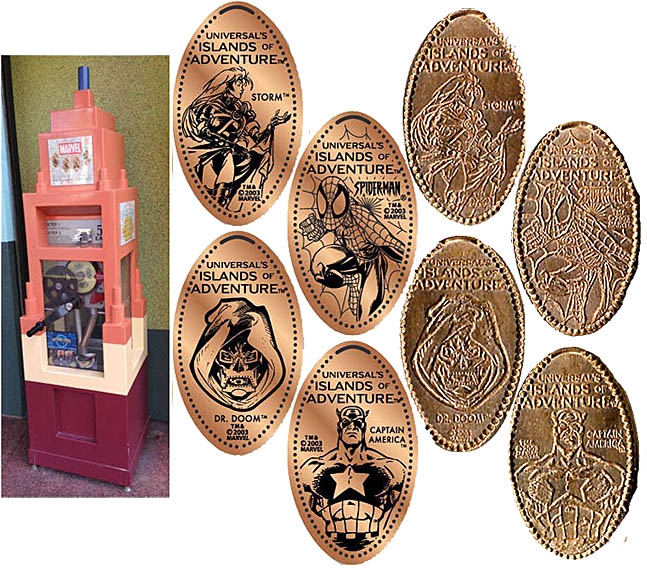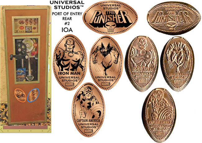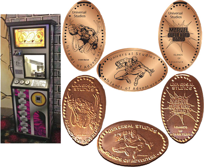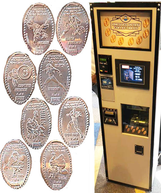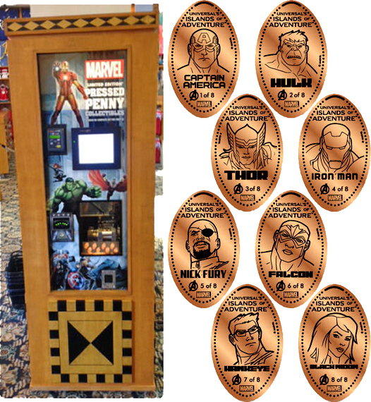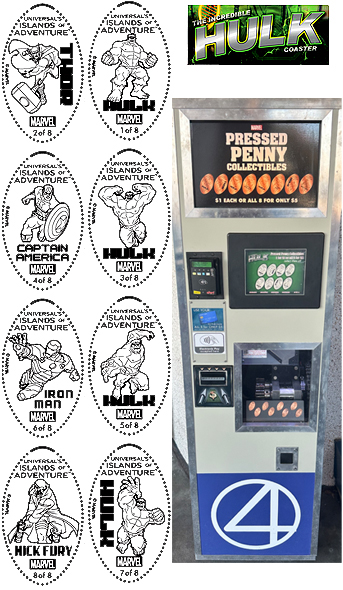 10/17: 8 penny machine found in Marvel Alterniverse Store. Designs are – Capt. America/ Hulk/ Thor/ Iron Man/ Nick Fury/ Falcon/ Hawkeye/ Black Widow. Moved machines 1 and 2, four-penny machines, not seen in store.