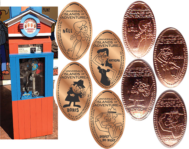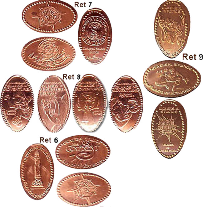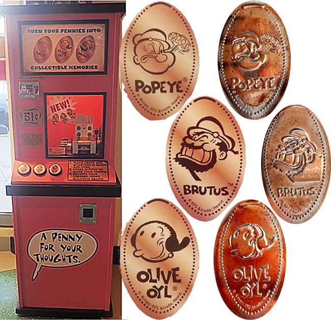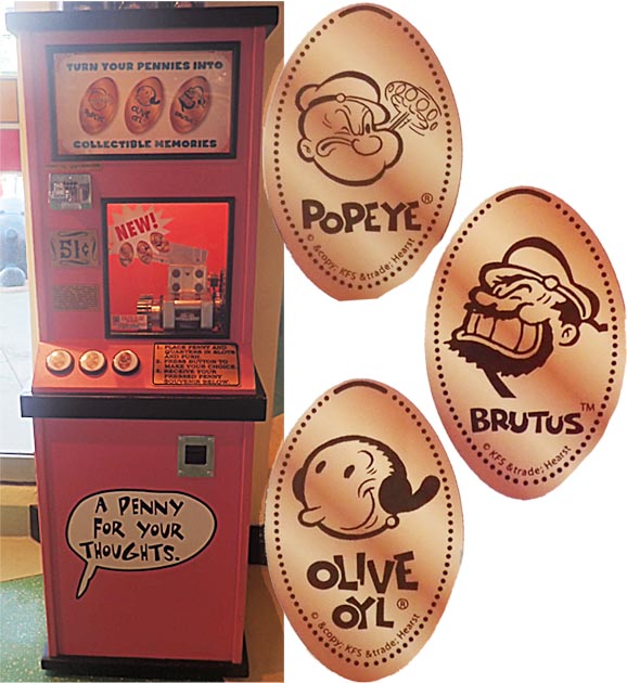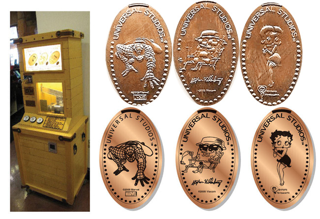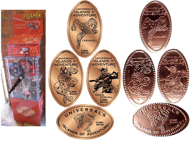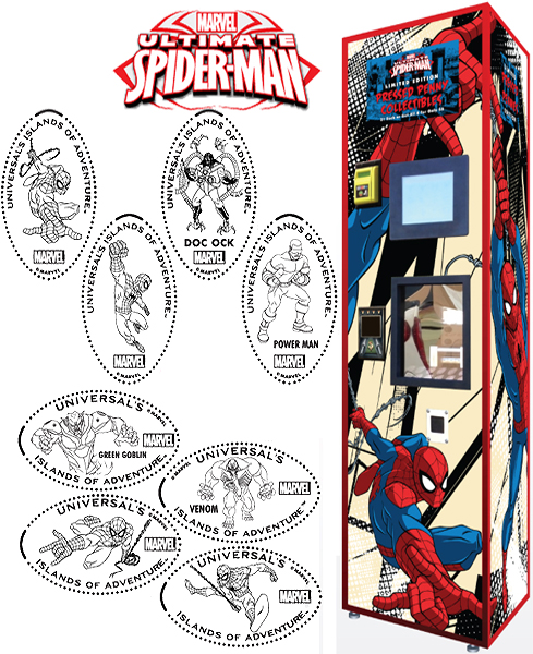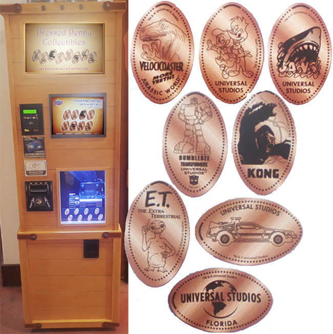 10/17: 8 penny machine found in Marvel Alterniverse Store. Designs are – Capt. America/ Hulk/ Thor/ Iron Man/ Nick Fury/ Falcon/ Hawkeye/ Black Widow. Moved machines 1 and 2, four-penny machines, not seen in store.