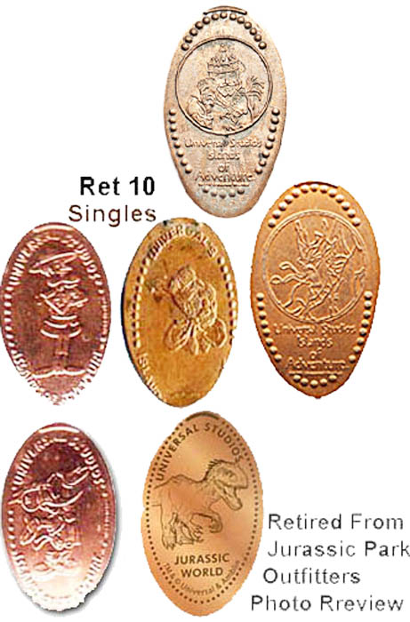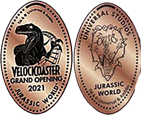 Retired 12: (Jurassic Park Discovery Center (downstairs): 1) Jurassic World logo (h) , 2) Velcoicoaster raptor w/ track Grand Opening 2021 (v), 3) Raptor looking left.