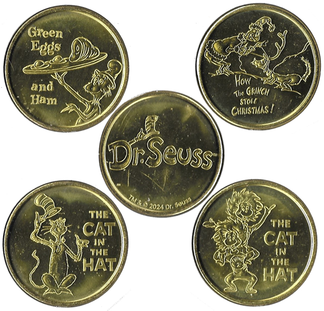 1) 'Tha Cat in the Hat', Things 1 & 2, 2) 'Tha Cat in the Hat', the Grinch, 3) 'How the Grinch Stole Christmas', Grinch and Max the Dog, 4) 'Green Eggs and Ham', Grinch holding a tray with food, Rear- 'Dr Seuss', with arm extended right holding his hat.